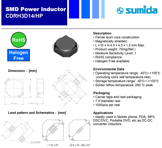 5.CDRH3D14HP最小包裝1KPCS 6.廣泛應用于LCD、OLED顯示模組及其他各類電子儀器儀表