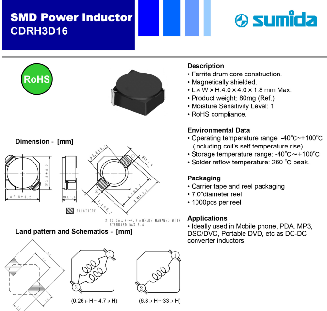 5.CDRH3D16最小包裝1KPCS 12.廣泛應用于手持便攜電子設備及其他各類電子儀器儀表