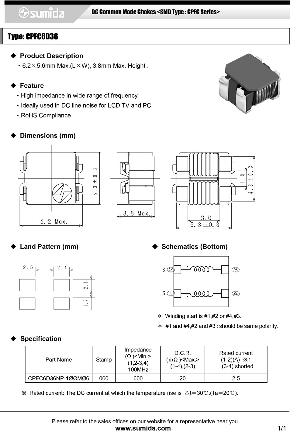 5.CPFC6D36廣泛用于LCD TV 和各類工業(yè)控制主機(jī)上的DC電源端共模信號抑制。