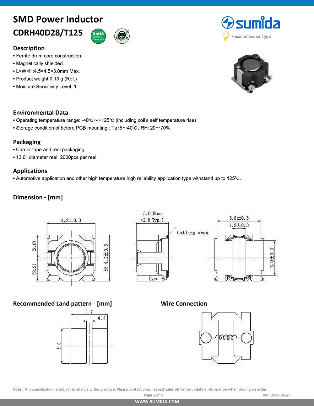 6.CDRH40D28T125廣泛應用于各類汽車部件產品,ECU電源控制及有車規、高溫要求的DC-DC電源供電模塊,